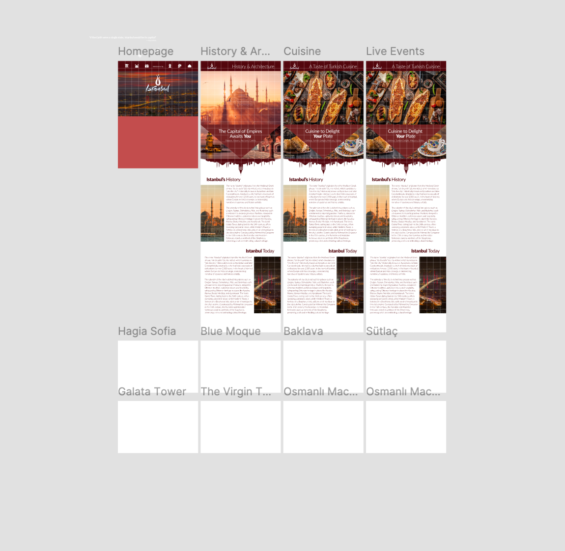 Creating a flow chart, I decided on three main pages that branch out into different sectors. History, Cuisine and Culture were the best topics to focus on for a tourist, as it gives them clarity, simplifies it, and puts them in the know of what to expect for their trip to Istanbul.