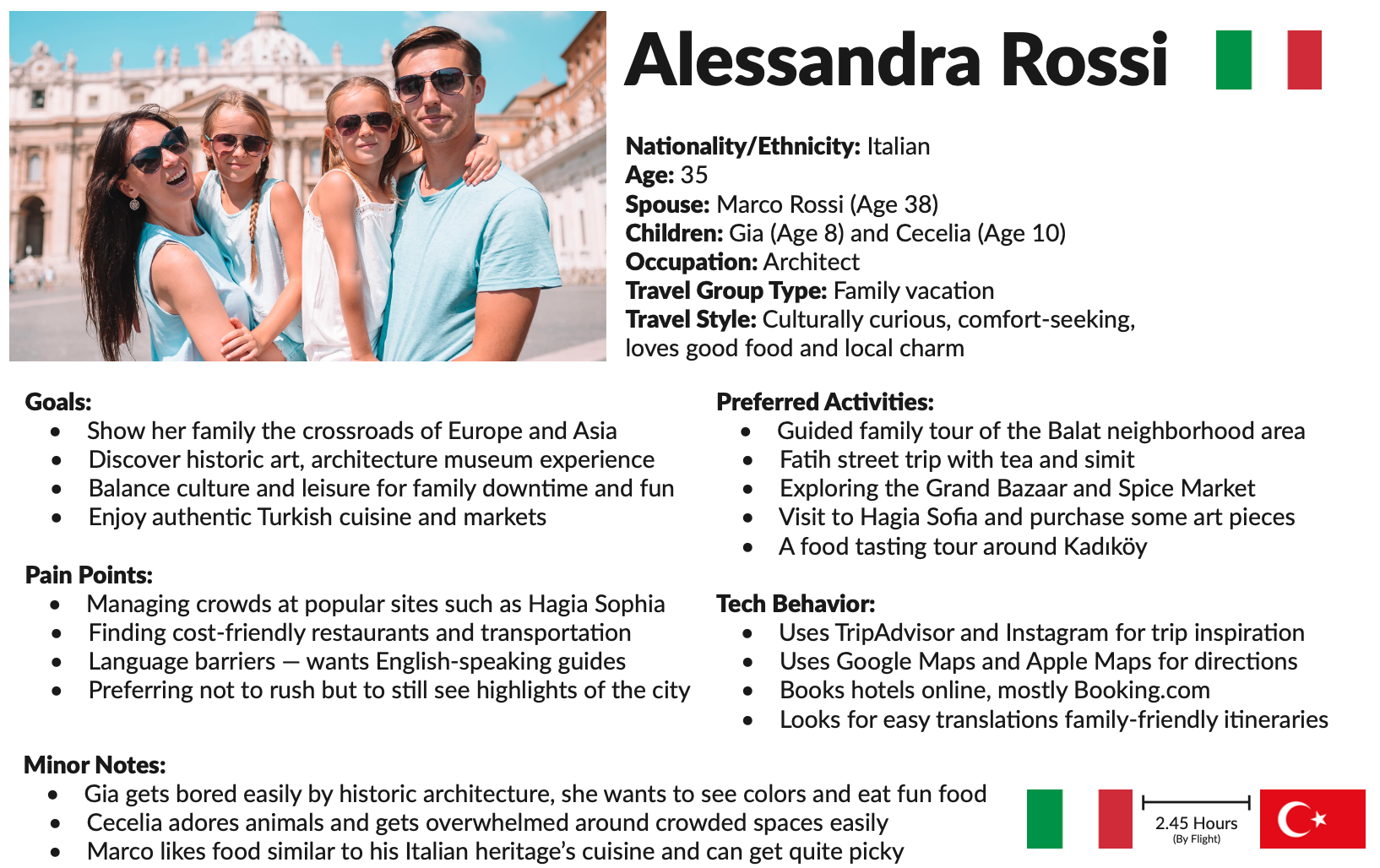 Creating a persona helped me get an understanding of my audiences. Alessandra is a mother to two young children based in Italy (roughly 3 hour flight to Istanbul), so her interests vary depending on her excitable, yet picky family!