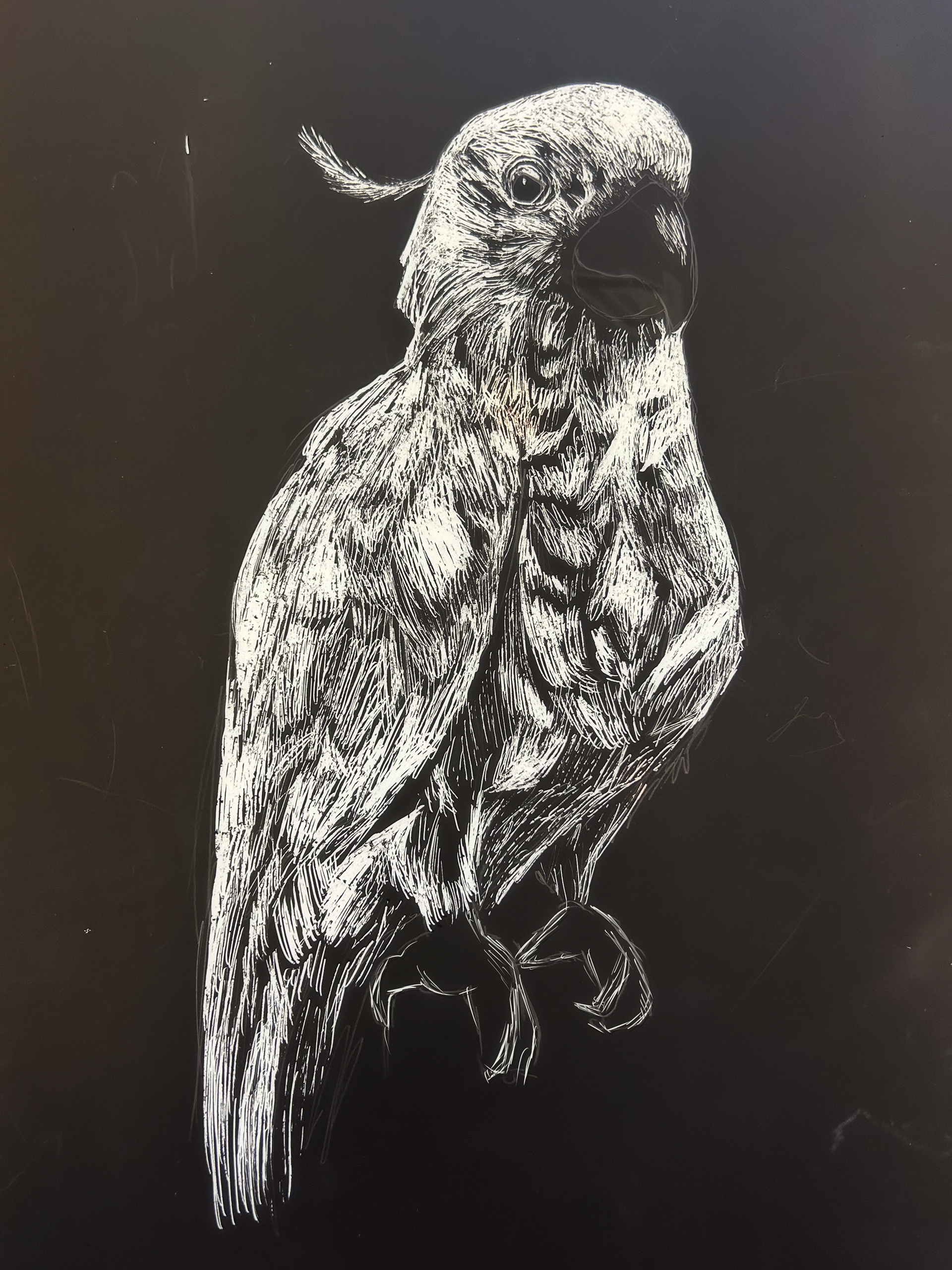 This piece was a practice of rendering light through clusters of scratches using a black scratchboard and an etching needle! I used clusters and empty negative space to create the rendering, a cockatoo being my model for bold whites!